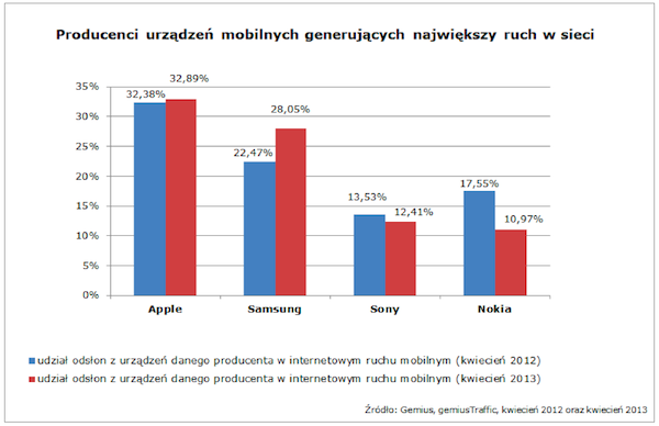 Największy procentowy wzrost w ogólnej liczbie odsłon mobilnych zanotował Samsung – 25%. Udział urządzeń Samsunga w całym ruchu to obecnie 28%. W analizowanym okresie zmniejszyła się natomiast sieciowa aktywność takich producentów jak Nokia (spadek o 37 proc. do 11 proc.) oraz Sony (spadek o 8 proc. do 12 proc.).