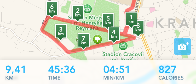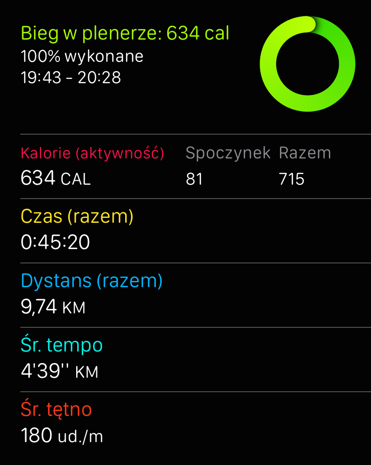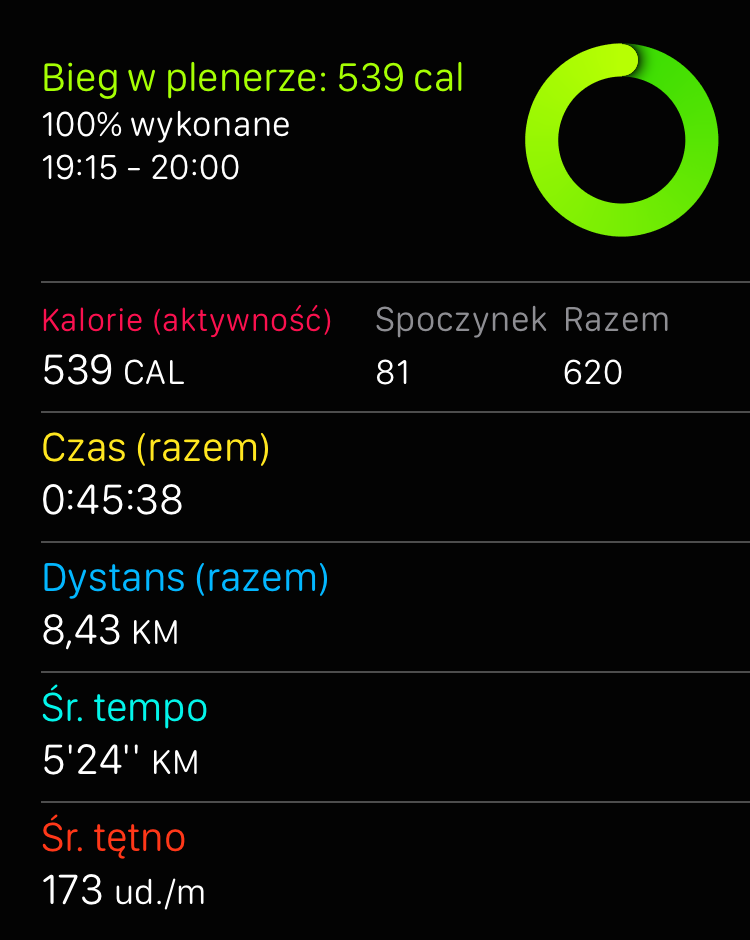Nie jest jeszcze idealnie, ale wyniki są już zdecydowanie bardziej zbliżone do rzeczywistych. Z mojego doświadczenia z bieganiem wiem też, że na takim odcinku powinienem spalić 700-750 kalorii, więc wskazania Apple Watch już w tej chwili wydają mi się bardzie dokładne niż RunKeepera.