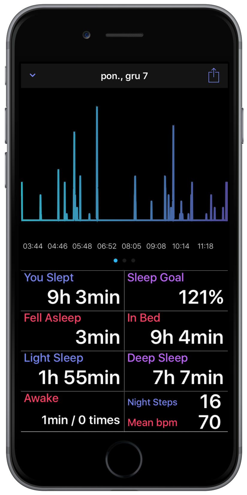 Co ciekawe, podobnie jak w przypadku aplikacji aktywności od Apple, deweloperzy Sleep Pulse pozwalają nam ustalić swój nocny cel snu określany w godzinach. Program prowadzi również tygodniowe, miesięczne i geeralne statystyki długości snu, zasypiania i średniego tętna. Wykresami naszego snu możemy podzielić się przez praktycznie każdą aplikację, bowiem są one zapisywane w formie pliku graficznego.