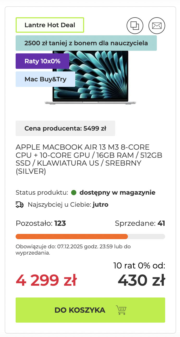 MacBook Air 13″ z M3, 16 GB RAM, 512 GB SSD: 5499 zł -> 4299 zł