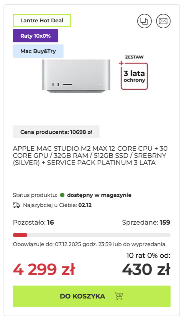 6. Mac Studio z M2 Max, 32 GB RAM, 512 GB SSD + 3 lata Service Pack Platinum: 10698 zł -> 4299 zł