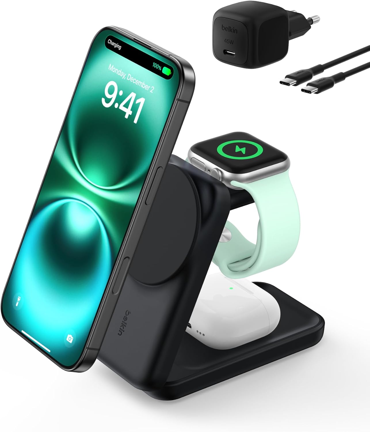 Belkin UltraCharge – superszybka stacja ładowania 3w1, kompatybilna z MagSafe, Qi2 25 W, w zestawie zasilacz 45 W i kabel USB-C 1,5 m: 499 zł -> 389 zł