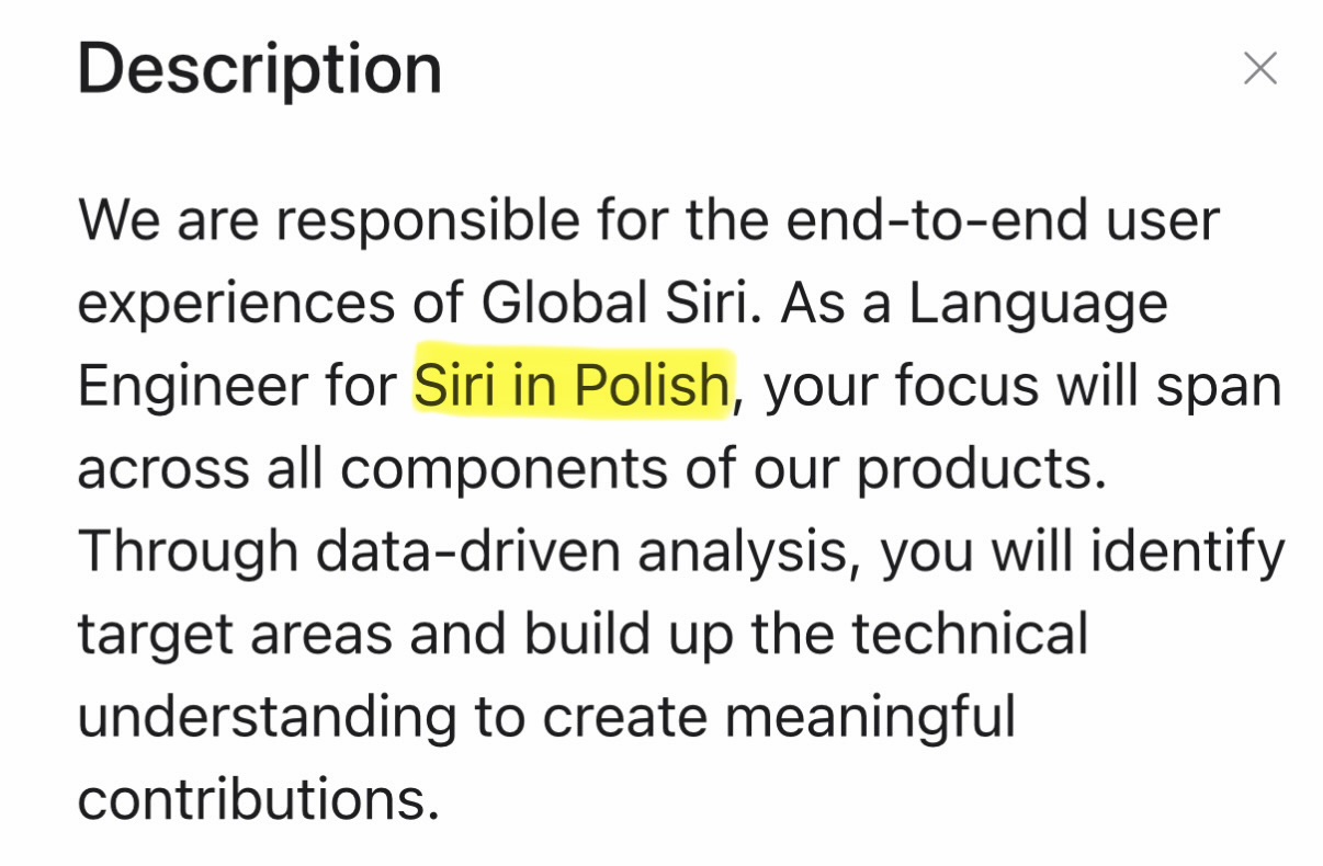 O ile już wcześniej pojawiały się oferty pracy w globalnym zespole Siri dla osób mówiących po polsku, to jeszcze nigdy w opisie stanowiska nie było napisane czarno na białym, że osoba ta będzie pracowała nad Siri w języku polskim.