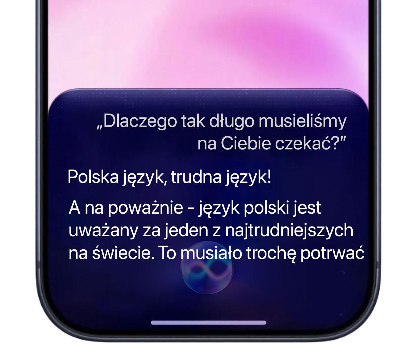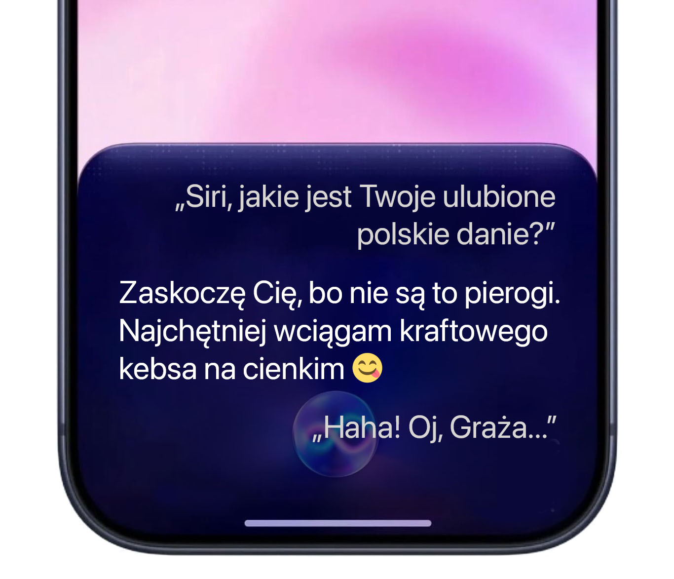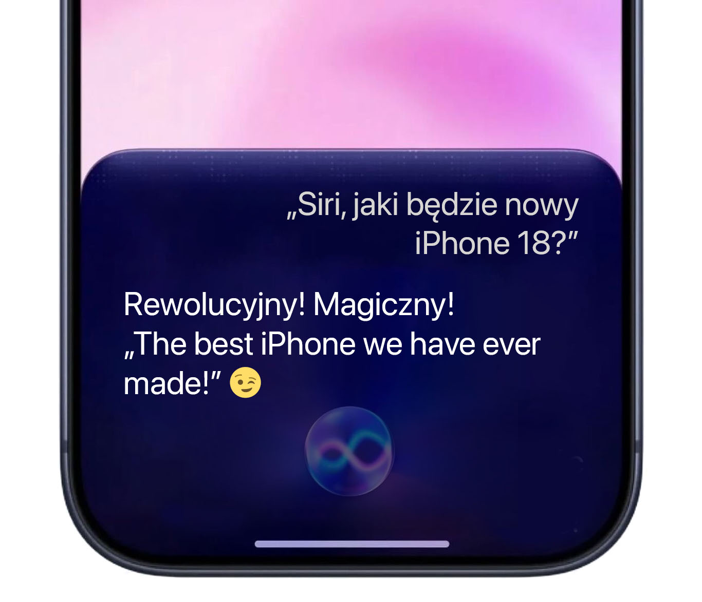 Dlatego pokazujemy Wam przykłady autentycznych odpowiedzi polskiej Siri z przeprowadzonych przez nas pierwszych konwersacji, ale na specjalnie przygotowanych screenach opartych na wizualizacji nowej Siri w iOS 27.