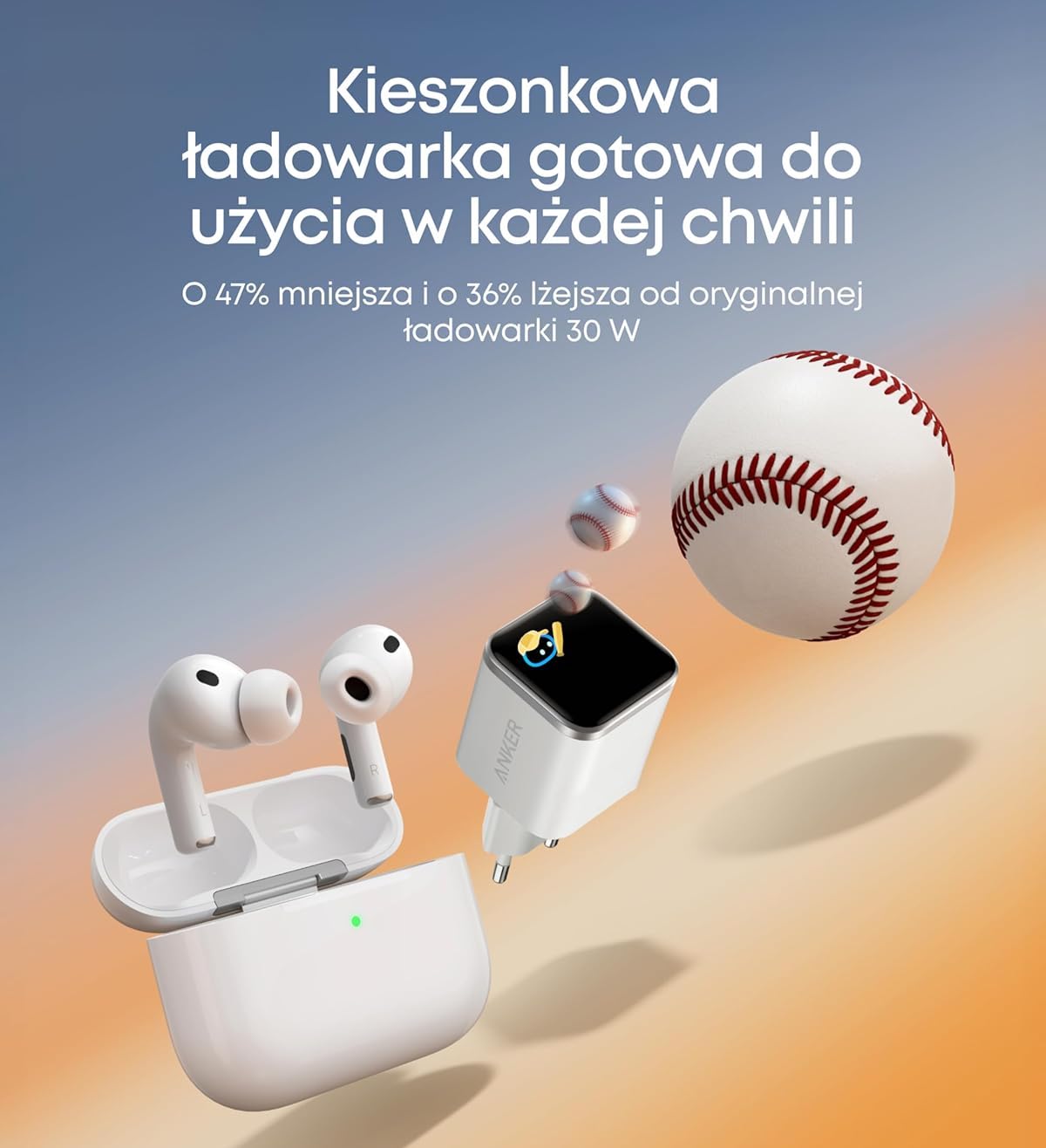 - bardzo mała i lekka: jest o 47% mniejsza i 0 36% lżejsza od oryginalnej ładowarki 30 W od Apple