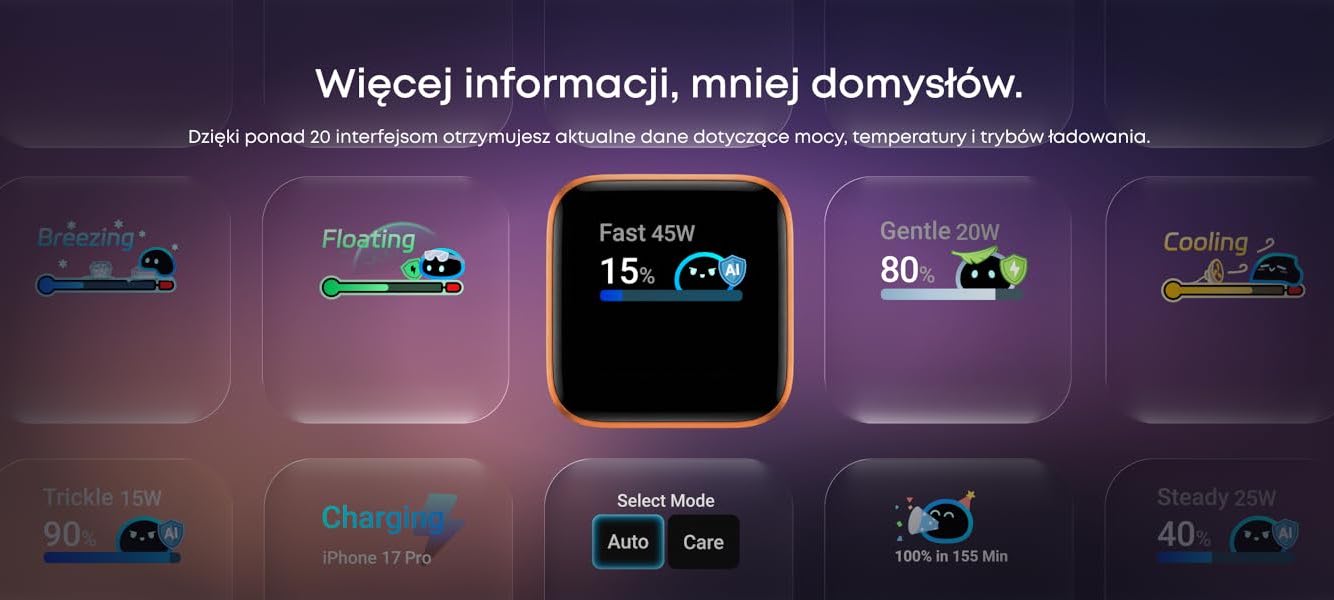 - informacje o mocy, temperaturze i trybie ładowania w czasie rzeczywistym