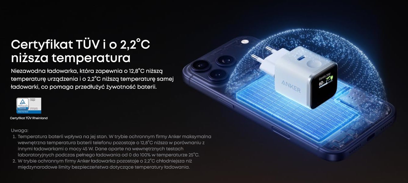 - pomaga wydłużyć żywotność baterii iPhone’a/iPada dzięki certyfikowanemu przez TÜV trybowi ochronny – zapewnia o 12,8°C niższą temperaturę urządzenia i o 2,2°C niższą temperaturę samej ładowarki
