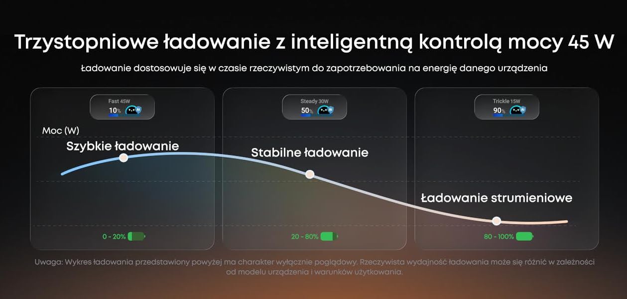 - szybkie ładowanie o mocy maksymalnej 45 W z inteligentną regulacją mocy – dostosowuje moc wyjściową w zależności od rodzaju/modelu urządzenia czy poziomu naładowania baterii