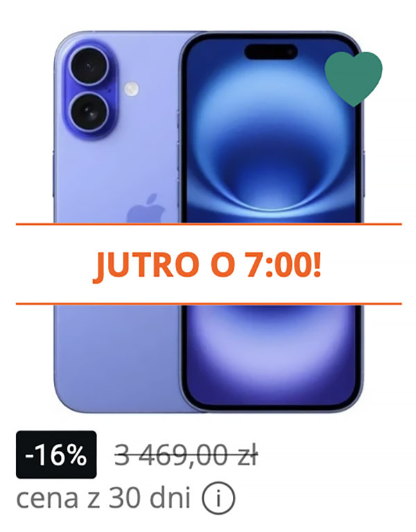 Jutro o 7:00 prawdziwy HIT – iPhone 16 (128 GB) za jedyne 2889 zł! I to w najładniejszym kolorze – ultramaryna!